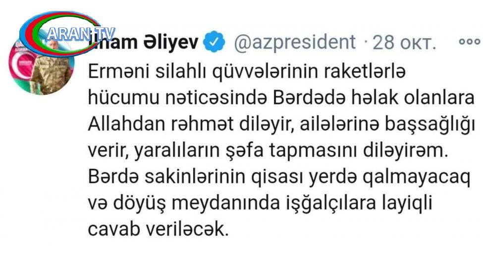 Erməni silahlı qüvvələrinin raketlərlə hücumu nəticəsində Bərdədə həlak olanlara Allahdan rəhmət diləyir, ailələrinə başsağlığı verir, yaralıların şəfa tapmasını diləyirəm. Bərdə sakinlərinin qisası yerdə qalmayacaq və döyüş meydanında işğalçılara layiqli cavab veriləcək.