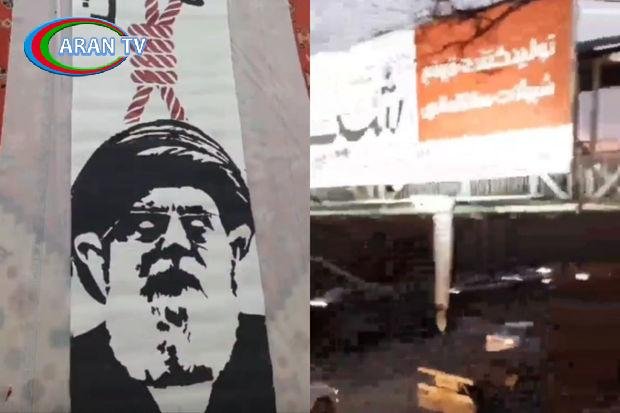 İranın Məşhəd şəhərində üzərində İranın ali rəhbərinin boğazı kəndirə keçirilmiş halda təsviri olan pankart asılıb.