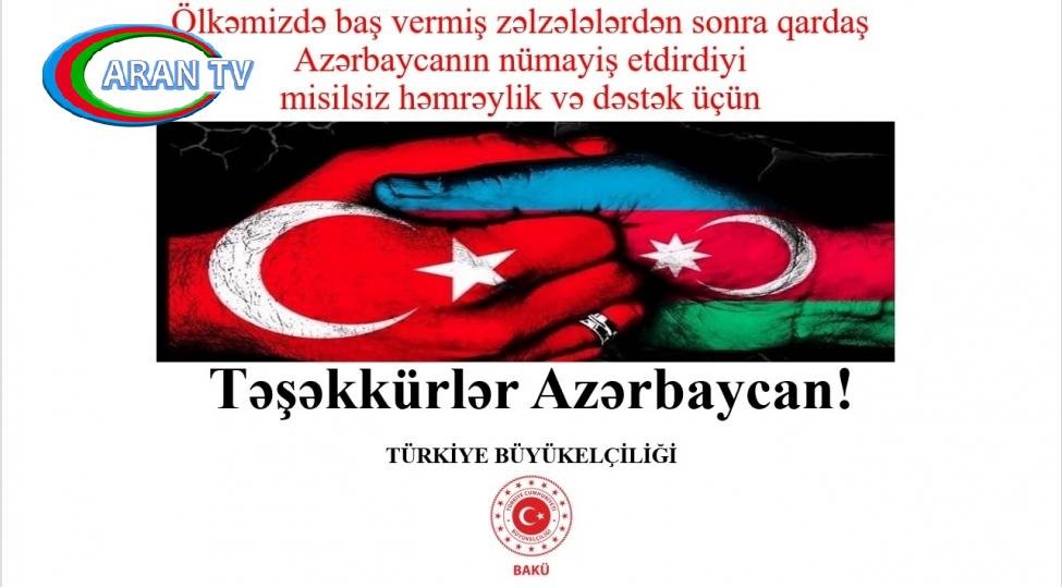 Türkiyənin ölkəmizdəki səfirliyi zəlzələ ilə əlaqədar qardaş ölkəyə köməyə görə Azərbaycana təşəkkür edib.