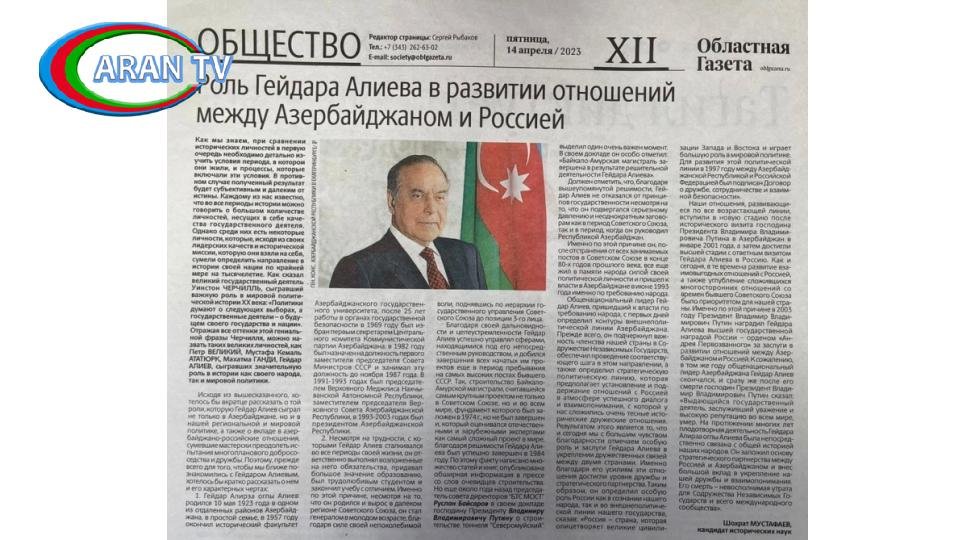 Rusiyanın Sverdlovsk vilayətinin rəsmi qəzeti “Oblastnaya qazeta”da Ümummilli Lider Heydər Əliyevin 100 illik yubileyinə həsr olunmuş “Azərbaycan ilə Rusiya arasında münasibətlərin inkişafında Heydər Əliyevin rolu” adlı məqalə dərc edilib.