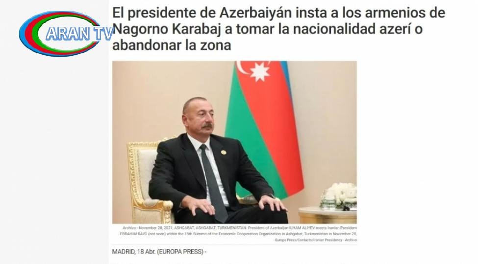 Avropanın bir sıra ölkələrinin KİV-ləri də Prezident İlham Əliyevin Azərbaycan Televiziyasına müsahibəsində söylədiyi fikirləri geniş işıqlandırıb. İspan dilində yayımlanan “Europapress”, “La Nacion”, “Cope”, “Diariosigloxxi”, “Grupolaprovincia”, “Teleprensa”, “Notimerica”, Macarıstanın “Demokrata.hu”, “Hirado”, “Portfolio” saytları, həmçinin Bolqarıstanın “Focus-news”, “Actualno”, Moldovanın “Timpul” kimi media qurumları Azərbaycan Prezidentinin “Biz dəfələrlə bəyan etmişdik ki, daxili işlərimizi heç bir ölkə ilə müzakirə etməyəcəyik. Qarabağ bizim daxili işimizdir. Qarabağda yaşayan ermənilər ya Azərbaycan vətəndaşlığını qəbul etməlidirlər, ya da ki, özləri üçün başqa yaşayış yeri tapmalıdırlar” bu fikirlərini xüsusi vurğulayıb. Oxucuların diqqətinə çatdırılıb ki, Prezident İlham Əliyev burada tam sərbəstliyin olduğunu, bütün demokratik əsasların təklif edildiyini, bu məsələnin insan hüquqları əsasında öz həllini tapmasının vacibliyini bildirib.