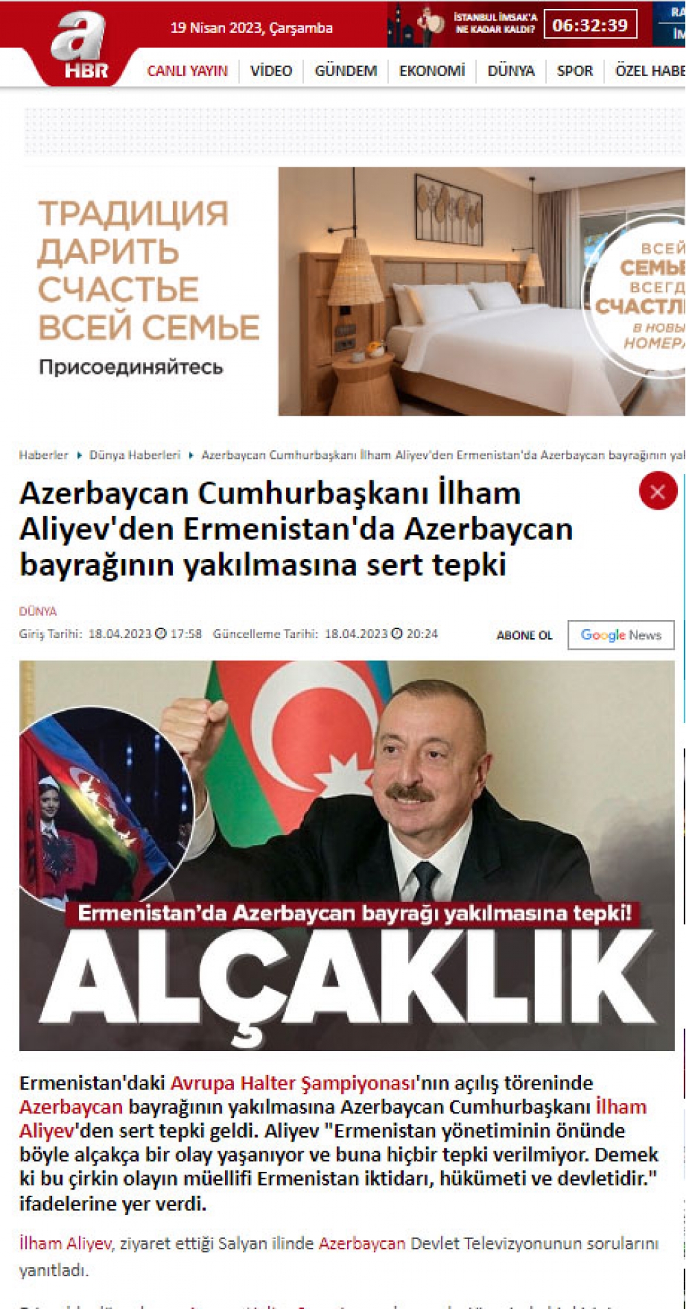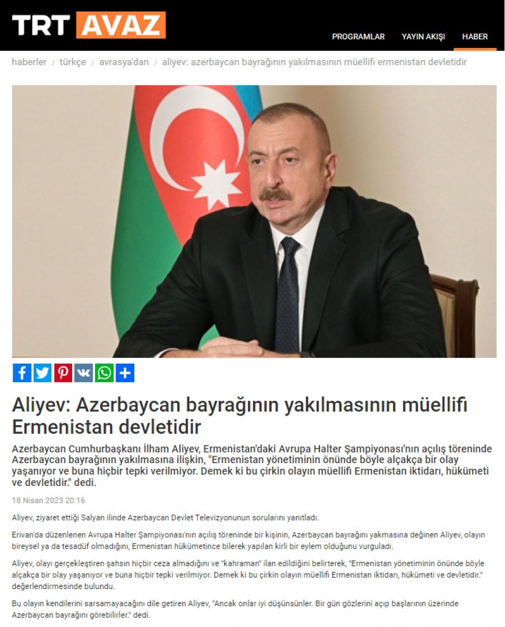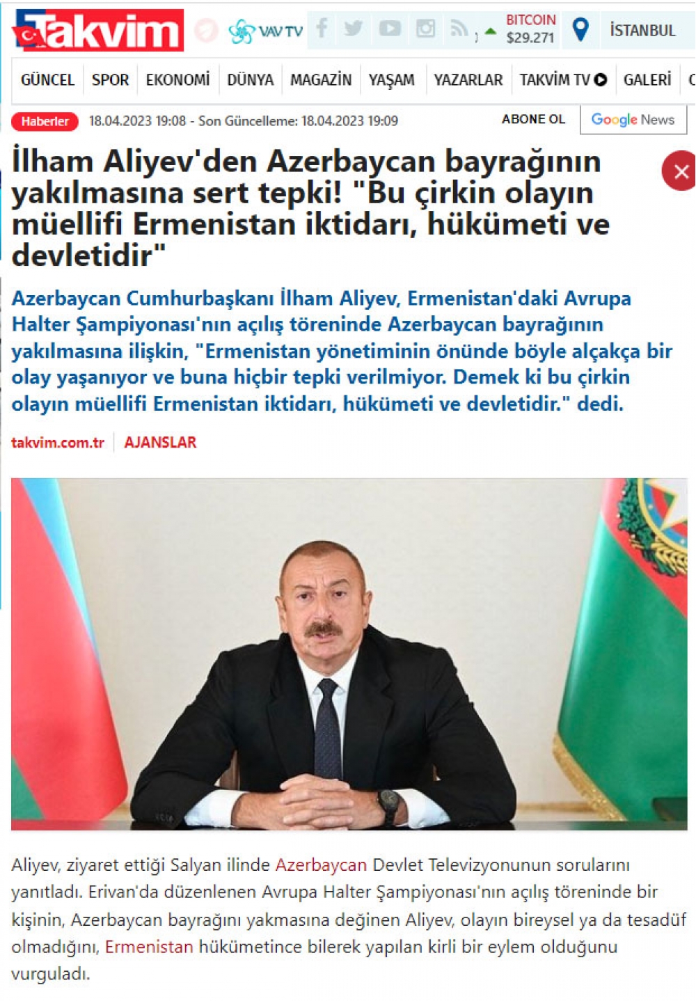 Türkiyənin Anadolu agentliyinin, “TRT Haber”, “TRT Avaz”, “AHaber” televiziyalarının, “Türkiye”, “Takvim”, “Yeni Şafak”, “Daily Sabah”, “Sözcü” və digər KİV-lərinin yaydığı xəbərlərdə dövlətimizin başçısının Qarabağda yaşayan ermənilərə xəbərdarlıq etməsi barədə fikirləri xüsusilə qabardılıb. Məqalələrdə dövlətimizin başçısının İrəvanda ağır atletika üzrə Avropa çempionatının açılış mərasimində Azərbaycan Bayrağının yandırılmasının sıradan hadisə olmaması, bu təxribatın arxasında Ermənistan dövlətinin dayanması barədə fikirləri önə çəkilib: “Ermənistanın siyasi rəhbərliyinin gözü önündə belə bir rəzil hadisə baş verir və buna heç bir reaksiya verilmir. Deməli, Ermənistan hakimiyyəti, hökuməti, dövləti bu çirkin əməlin müəllifidir”.