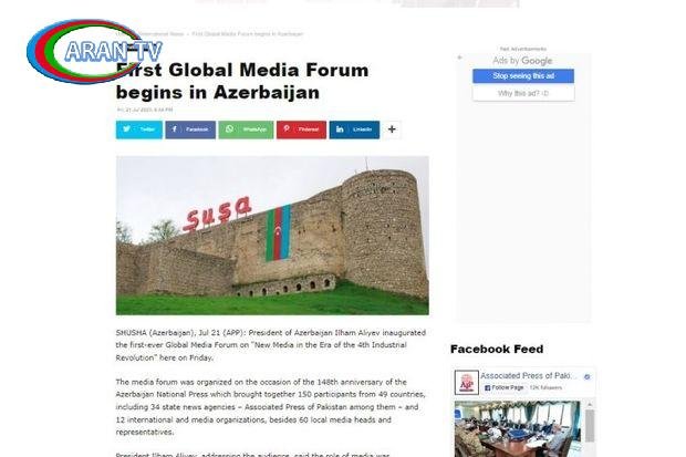AZƏRTAC xəbər verir ki, Pakistanın rəsmi “Associated of Pakistan” agentliyi Azərbaycan Prezidenti İlham Əliyevin Forumda çıxışından əsas məqamları dərc edib. Agentliyin materialında diqqətə çatdırılıb ki, Azərbaycan Milli Mətbuatının 148-ci ildönümü ilə bağlı keçirilən Forumda 49 ölkədən 150 xarici qonaq, o cümlədən dünyanın 34 ölkəsinin dövlət informasiya agentliyi, 12 beynəlxalq təşkilat və media qurumu, 60 yerli media rəhbəri və nümayəndəsi iştirak edir.