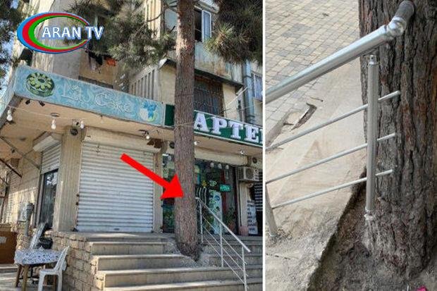 Belə ki, Nizami rayonu, Cəmşid Naxçıvanski küçəsində fəaliyyət göstərən istirahət məkanlarından birində dəmir məhəccər ağaca bərkidilib.
