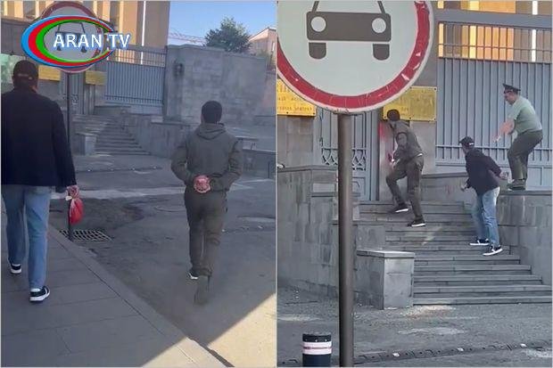 Kadrlarda iki nəfərin diplomatik korpusa tərəf qaçdığı və əllərindəki içində rəngli maye olan plastik torbanı darvazaya çırpdıqları görünür.