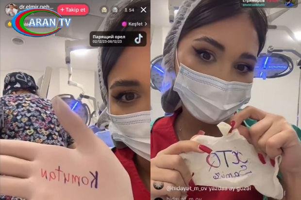 Belə ki, əməliyyat gedərkən həkimin assistenti olduğunu bildirən xanım “TikTok” platformasında canlı yayım açıb. Canlı yayım zamanı izləyicilər şərh bölməsindən xanıma “Komutan”, XTQ, “Hidayət” kimi sözləri əlinə yazmasını istəyirlər. Xanım isə əlcəklərin üzərinə qeyd edilən sözləri yazır.