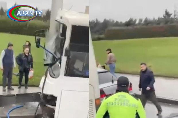 Bakıda sərnişin avtobusu işıq dirəyinə çırpılıb, yolda tıxac yaranıb – VİDEO