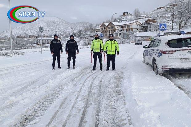Laçında polis əməkdaşları qarlı hava şəraitində xidməti fəaliyyətlərini davam etdirirlər.