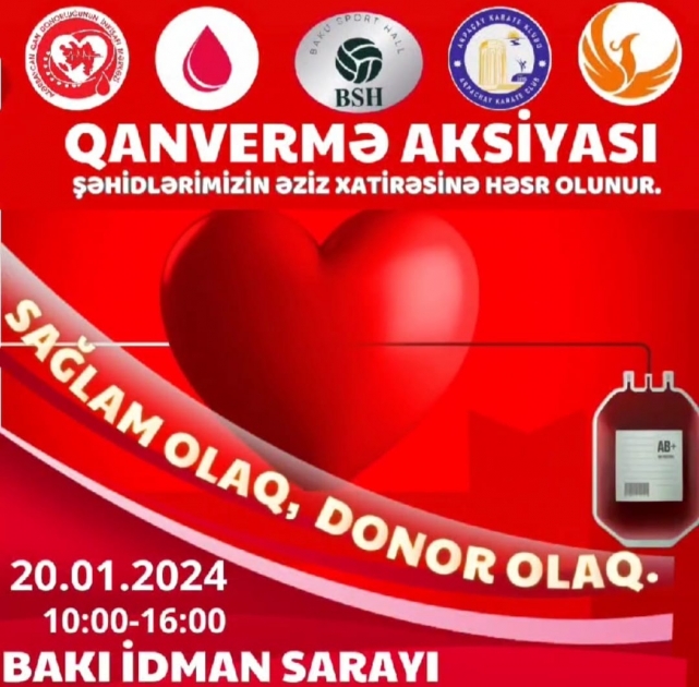 Qanvermə aksiyası yanvarın 20-də, saat 10:00-dan 16:00-dək Bakı İdman Sarayında həyata keçiriləcək. Toplanan qan ehtiyatı yoxlanılaraq talassemiya, hemofiliya, eləcə də leykoz (qan xərçəngi) xəstəliyindən əziyyət çəkən şəxslər üçün istifadə olunacaq.