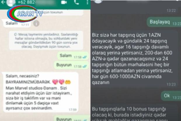 Xezerxeber.az-ın məlumatına görə, mesajlarda ya hər hansı reklamı izlədikdən sonra ödəniş almaq, ya da hər hansı videoya şərh yazdıqdan sonra qazanc əldə ediləcəyi vəd edilir.