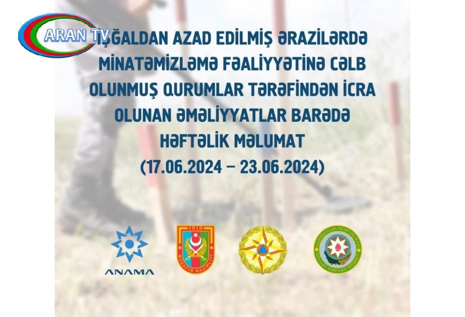 Azərbaycan Respublikasının Minatəmizləmə Agentliyi (ANAMA) işğaldan azad edilmiş ərazilərdə minatəmizləmə fəaliyyətinə cəlb olunmuş qurumlar tərəfindən iyunun 17-dən 23-dək icra edilən minatəmizləmə əməliyyatlarına dair məlumatı açıqlayıb.