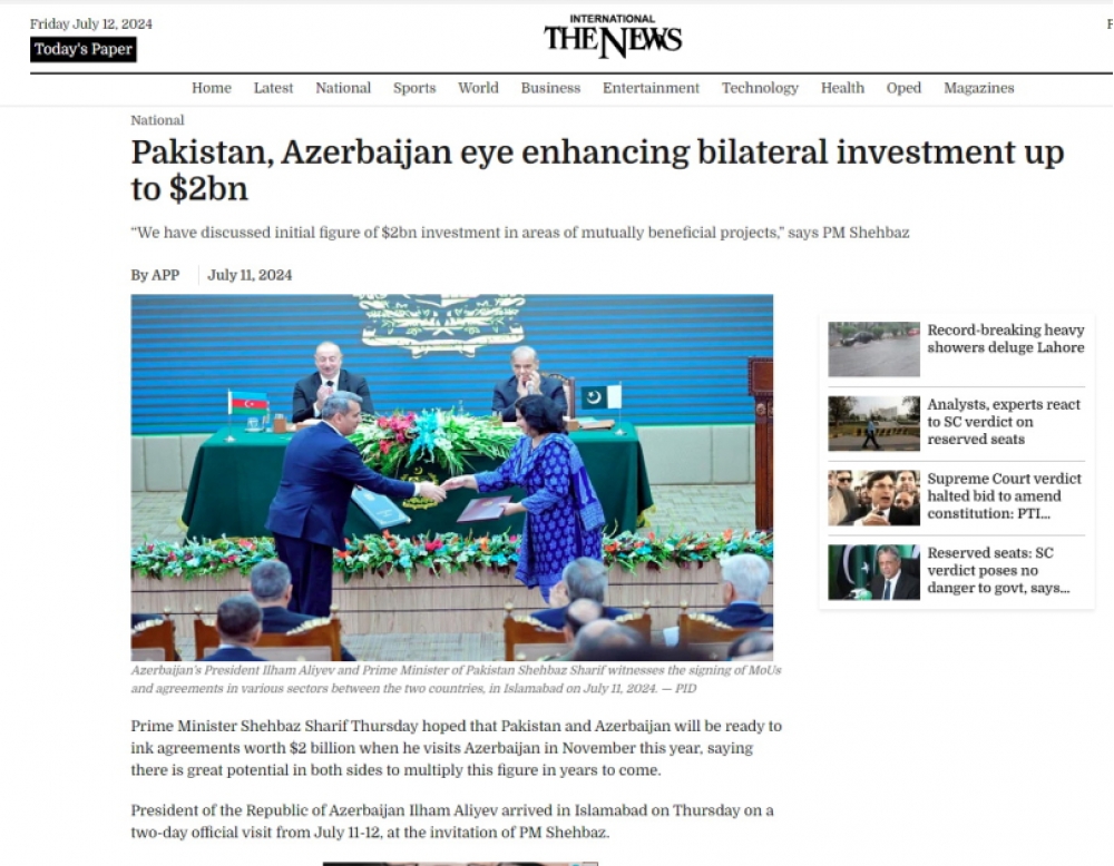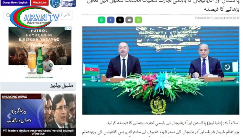 ARANTV.AZ xəbər verir ki, ingilis dilində nəşr olunan “The Express Tribune” qəzeti “Pakistanla Azərbaycan arasında əlaqələrin möhkəmləndirilməsinə dair 15 sənəd imzalanıb” sərlövhəli məqaləsində İslamabadda Azərbaycan ilə Pakistan arasında imzalanmış sənədlərin Azərbaycan Respublikasının Prezidenti İlham Əliyevin və Pakistan İslam Respublikasının Baş naziri Məhəmməd Şahbaz Şərifin iştirakı ilə mübadiləsi mərasimi barədə məlumat verilib. Oxucuların diqqətinə çatdırılıb ki, iki ölkənin Xarici İşlər nazirlikləri arasında əməkdaşlığa dair Anlaşma Memorandumu, tranzit və preferensial ticarət, mineral ehtiyatlar və geologiya, informasiya texnologiyaları və kommunikasiyalar, elm və texnologiya, kiçik və orta sahibkarlıq və digər sahələr üzrə sazişlər imzalanıb, həmçinin 2024-2029-cu illər üzrə mədəni mübadilə proqramının mübadiləsi olub.