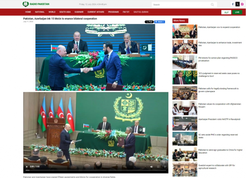 “Radio Pakistan”ın və “Associated Press of Pakistan” agentliyinin saytında, habelə “News of Pakistan” portalında Prezident İlham Əliyev və Baş nazir Məhəmməd Şahbaz Şərifin iştirakı ilə iki ölkə arasında sənədlərin imzalanması, həmçinin geniş tərkibdə keçirilən görüş haqqında məlumat verilib.