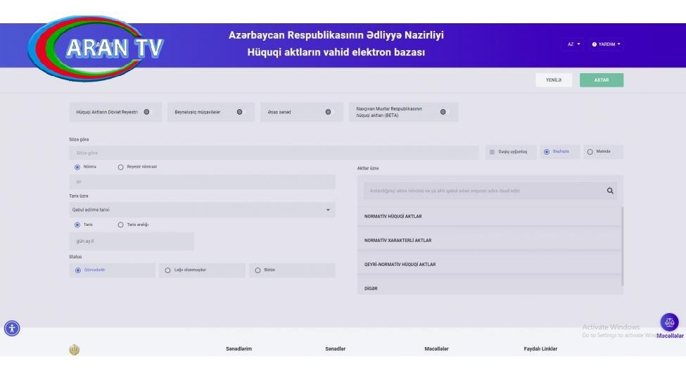 Bundan əlavə, “Axtarış” bölməsində normativ hüquqi aktlar, normativ xarakterli aktlar və qeyri-normativ hüquqi aktlar adlı üç yarımbölmə də mövcuddur ki, istifadəçilər axtardıqları hüquqi aktları növünə görə asanlıqla əldə edə bilərlər.
