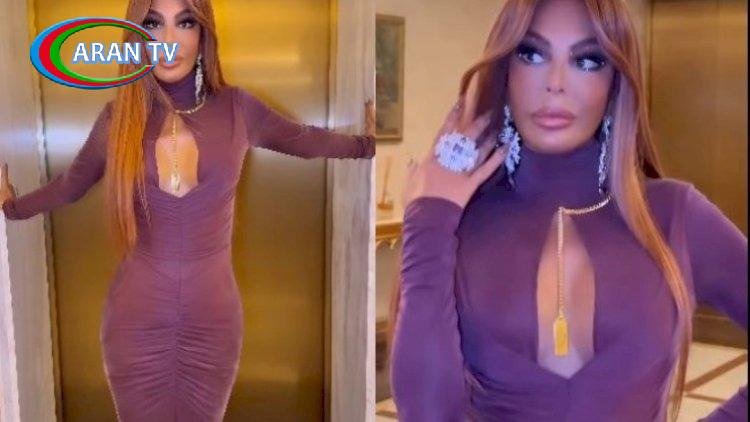 Pop kraliçası bənövşəyi uzun libasda kamera qarşısına keçib. Sinə dekolteli, uzun şleyfli geyimdə göz qamaşdırıb.