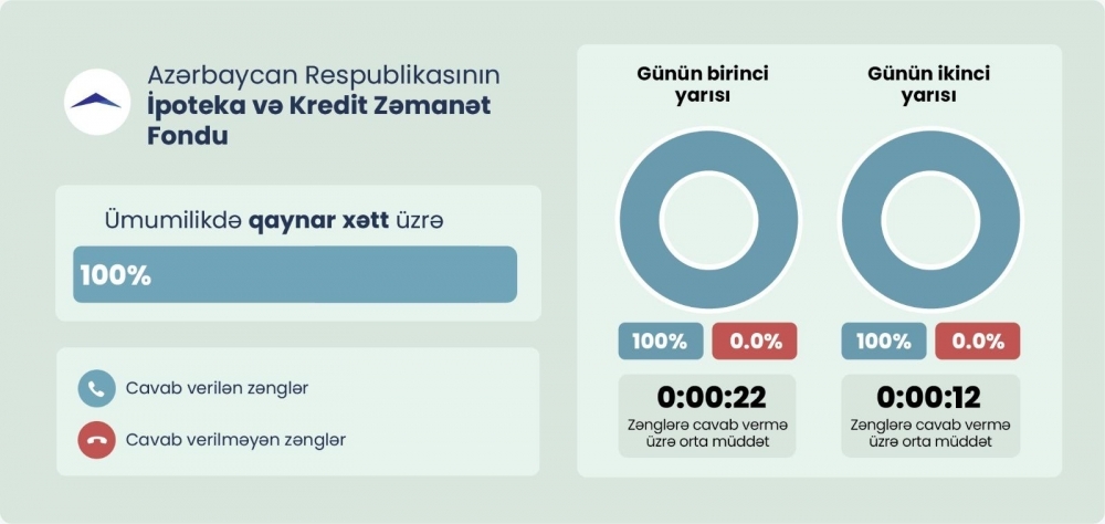 Azərbaycanın İpoteka və Kredit Zəmanət Fondunun qaynar xətti (stasionar nömrəsi yoxdur) üzrə cari ildə bütün monitorinq nəticələri müsbət olub, yəni günün brinci və ikinci yarısında edilən bütün zənglər yüksək operativliklə cavablandırılıb. Günün birinci yarısında zənglərə cavab vermə üzrə orta müddət 22 saniyə, günün ikinci yarısında 12 saniyə olub.