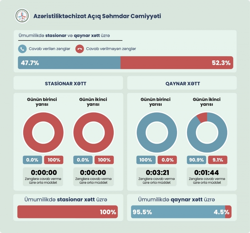 Bundan fərqli olaraq, “Azəriqaz” İstehsalat Birliyinin qaynar xətti üzrə zənglərin mütləq əksəriyyətinə və ya 81.8%-nə cavab verilib, 18.2%-nə cavab verilməyib. Günün birinci yarısında zənglərə cavab vermədə orta müddət 6 saniyə, günün ikinci yarısında 8 saniyə olub.