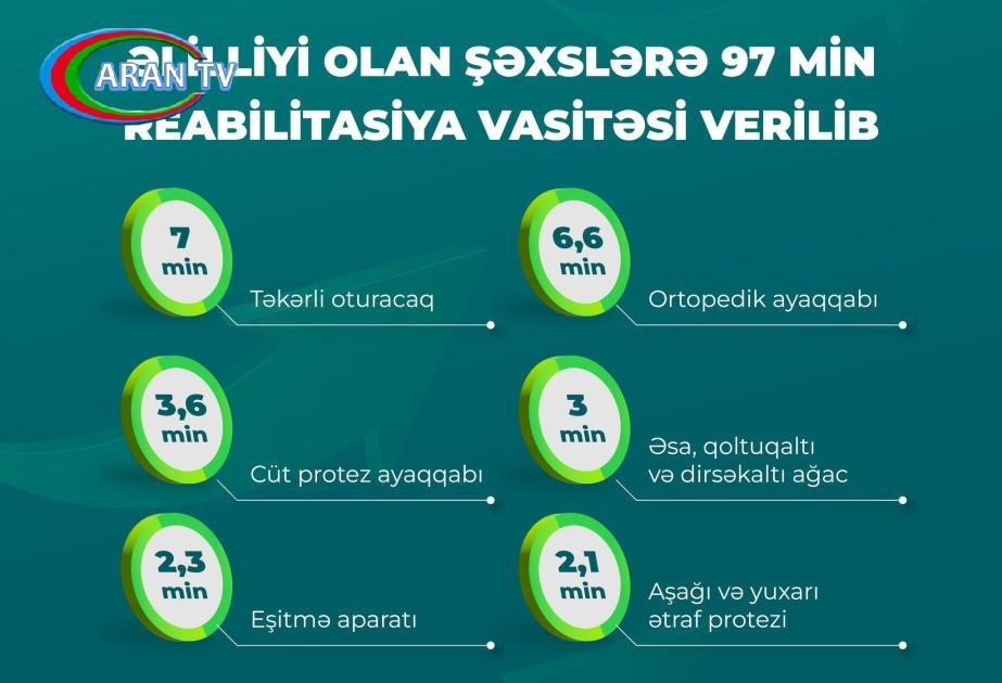 Nazirliyin İctimaiyyətlə əlaqələr şöbəsindən AZƏRTAC-a verilən məlumata görə, onlardan 7 mini təkərli oturacaq (o cümlədən 308-i mühərrikli təkərli oturacaq), 2,1 mini aşağı və yuxarı ətraf protezi, 2,3 mini eşitmə aparatı, 3 mini əsa, qoltuqaltı və dirsəkaltı ağac olub.