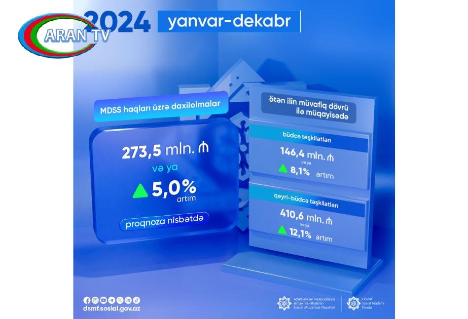 2024-cü ilin yanvar-dekabr ayları ərzində məcburi dövlət sosial sığorta haqları üzrə daxilolmalarda proqnoza nisbətdə 273,5 milyon manat və ya 5 faiz artım qeydə alınıb.
