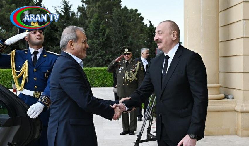 Sonra İran Prezidenti Məsud Pezeşkianın rəsmi qarşılanma mərasimi olub. Hər iki ölkənin dövlət bayraqlarının dalğalandığı meydanda İran Prezidentinin şərəfinə fəxri qarovul dəstəsi düzülüb. Azərbaycan Prezidenti İlham Əliyev İran Prezidenti Məsud Pezeşkianı qarşılayıb. Fəxri qarovul dəstəsinin rəisi İran Prezidentinə raport verib. Prezident İlham Əliyev və Prezident Məsud Pezeşkian fəxri qarovul dəstəsinin qarşısından keçiblər. İran Prezidenti Azərbaycan əsgərlərini salamlayıb. İran və Azərbaycanın dövlət himnləri səslənib. Azərbaycanın dövlət və hökumət nümayəndələri Prezident Məsud Pezeşkiana, İran nümayəndə heyətinin üzvləri Prezident İlham Əliyevə təqdim olunub.