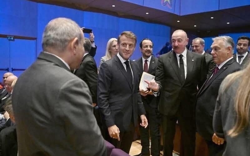 Şəkildə ön planda görünən üç simanı və bir ənsəni tanıyırsınız. Üzləri profildən görünən Azərbaycanın dövlət başçısı İlham Əliyev və Fransı lideri Emmanuel Makron, üzü obyektivə anfasdan düşən Macarıstanın lideri Viktor Orban, yalnız ənsəsi görünən isə Ermənistanın baş naziri Nikol Paşinyandır.