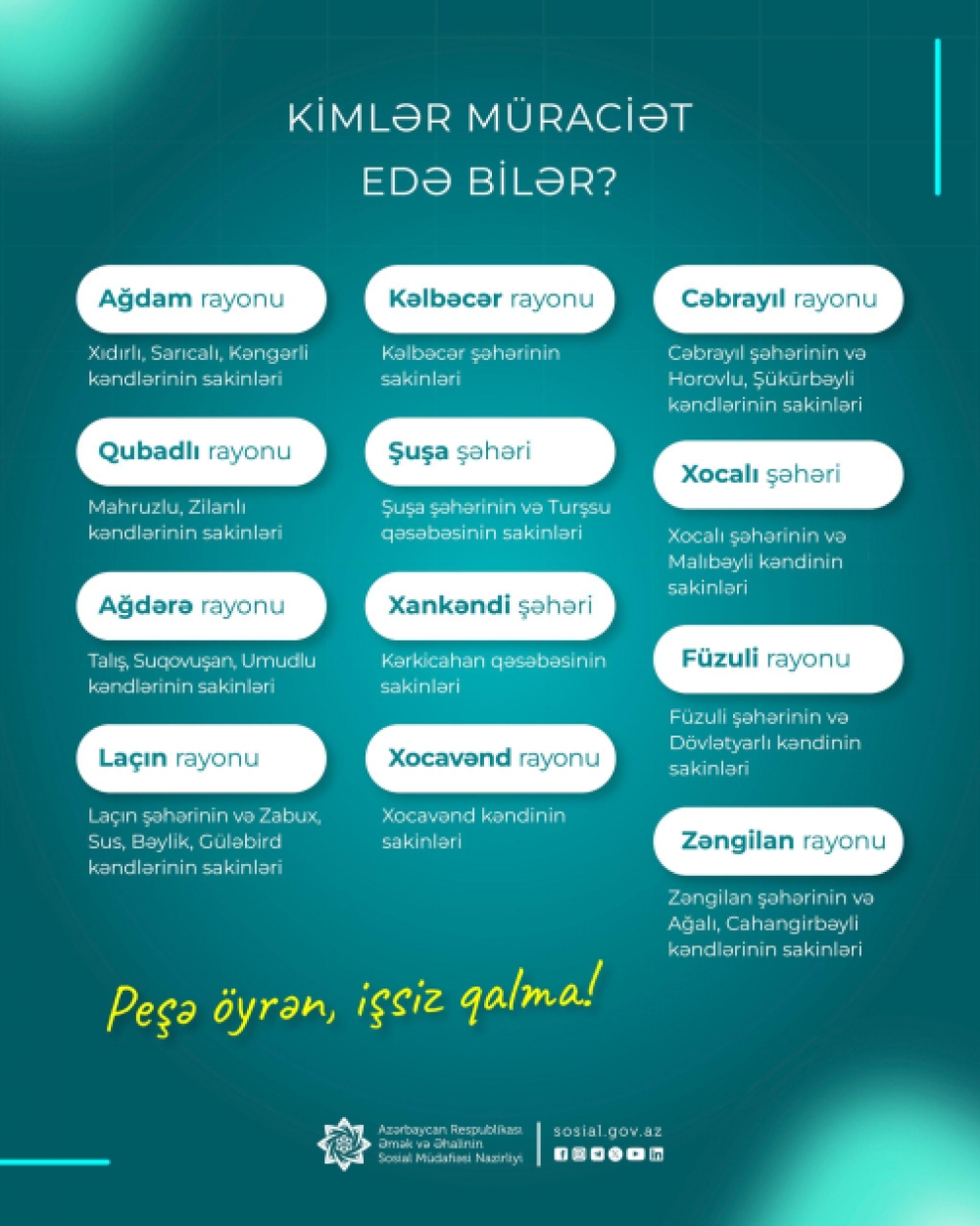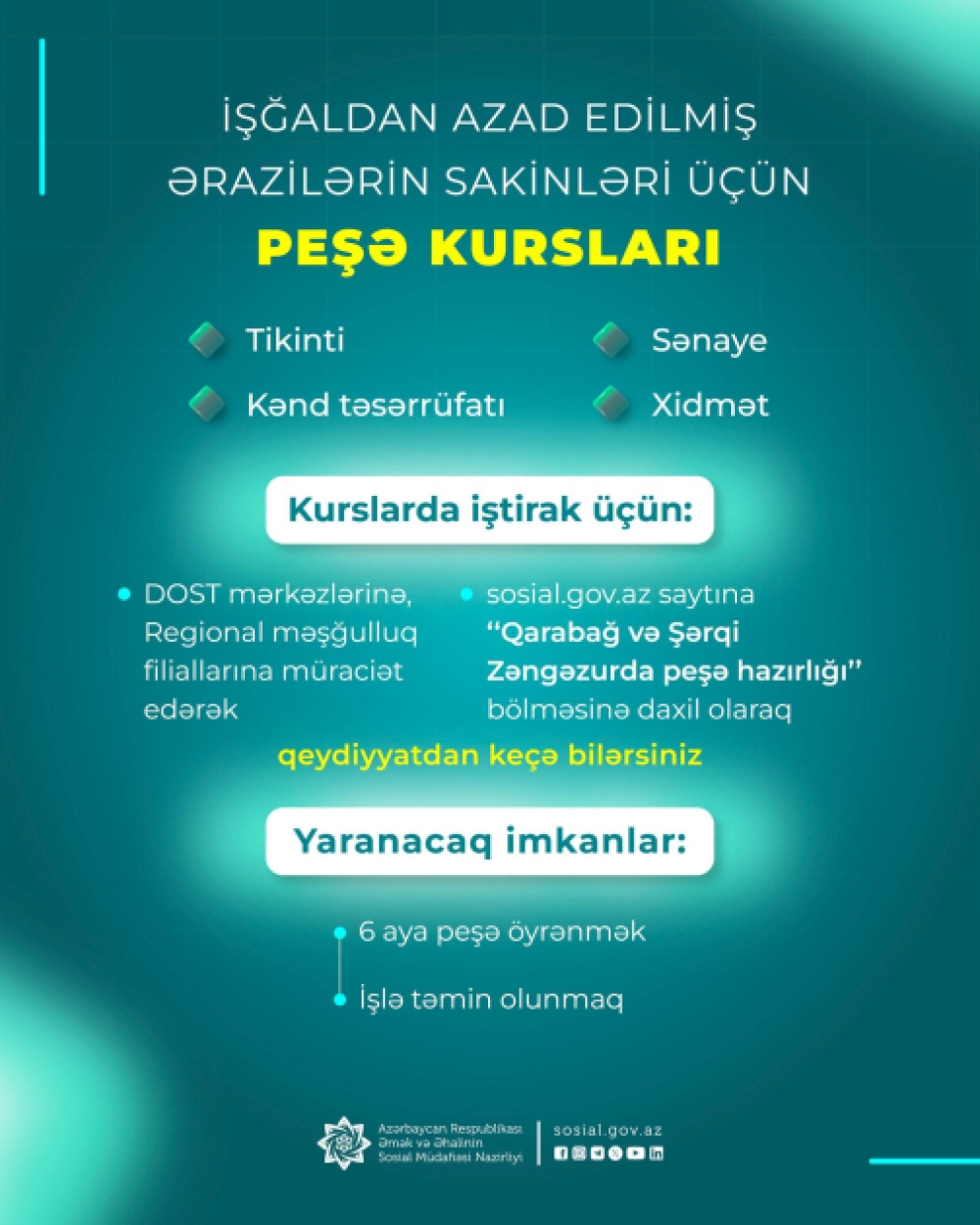 Qeyd edək ki, Agentlik hazırda Laçın şəhəri və Laçının Zabux, Sus, Bəylik, Giləbird kəndləri, Şuşa şəhəri və Şuşanın Turşsu qəsəbəsi, Füzuli şəhəri və Füzulinin Dövlətyarlı kəndi, Zəngilan şəhəri və Zəngilanın Ağalı, Cahangirbəyli kəndləri, Cəbrayıl şəhəri və Cəbrayılın Horovlu, Şükürbəyli kəndləri, Kəlbəcər şəhəri, Xocalı şəhəri və Xocalının Malıbəyli kəndi, Xankəndinin Kərkicahan qəsəbəsi, Qubadlının Mahruzlu, Zilanlı kəndləri, Ağdərənin Talış, Suqovuşan, Umudlu kəndləri, Ağdamın Xıdırlı, Kəngərli,Sarıcalı kəndləri, Xocavəndin Xocavənd kəndi sakinləri üçün peşə hazırlığı kursları təşkil edir.