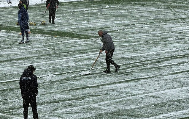 Misli Premyer Liqasının 19-cu turunda keçiriləcək “Şamaxı” – “Qarabağ” oyunundan öncə stadionun qardan təmizlənməsi işləri davam edir.